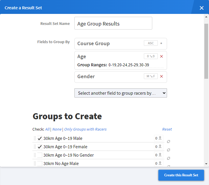 And finally, we will make an “Age Group” result set. You can do this by adding the Age field and the Gender field. When you select to group racers by an age field (or by any other number field) you are given the option to enter the ranges that will form your groups, as you can see in the picture below. The system then creates a result group for each of the combinations possible from your data.