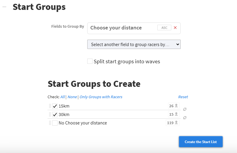 You’re timing a loppet ski race and have two distances for racers to choose from, a 15km and a 30km. You decide to base your start groups off of distance so that those doing the same distance start together. As such when you’re setting up your start list you choose to Split Racers into Start Groups and select the “Choose your distance” field from the registration form to define your start groups.The options available in that field (15km and 30 km) become the Start Groups in the race, as pictured below.