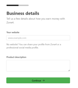 Select continue to fill in the application for a new stripe account, or to connect your existing account. Below is a screenshot of all the information you need to setup your stripe account. Note that you will need to have the following pieces of information handy: