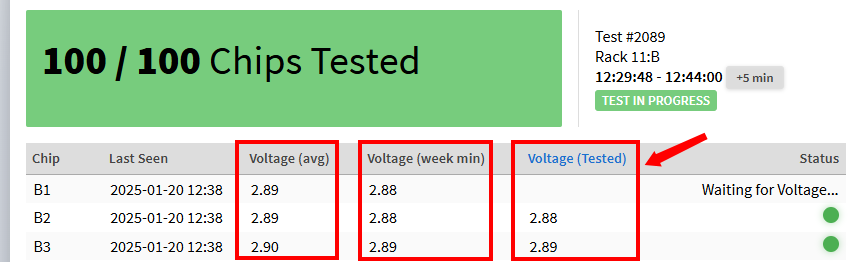 When looking at the chip voltages there are several indicators on the health of the batteries. Any new or recently refurbished rack will show all green indicators, however that does not mean that chips without the indicators are problematic.