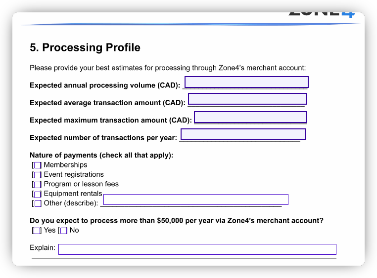 Again, this is generally information Zone4 already knows as we have many years of processing information from existing clubs. But the payment processor insists on it being on this form. This is on the form mainly for new organizations so we can get an idea of their business. You are fine to make ball-park estimates we we will double check the historical values to correct if needed.