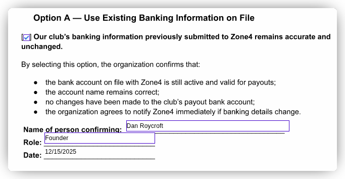 Thank you for your time completing this, it’s a necessary requirement for us to continue to offer your club the use of our merchant account for payment processing. Please note that at any time you can elect to get your own merchant account via one of our other providers, but we understand the on-boarding process can be more painful that this form so we’re trying to keep this option available for those that need it.